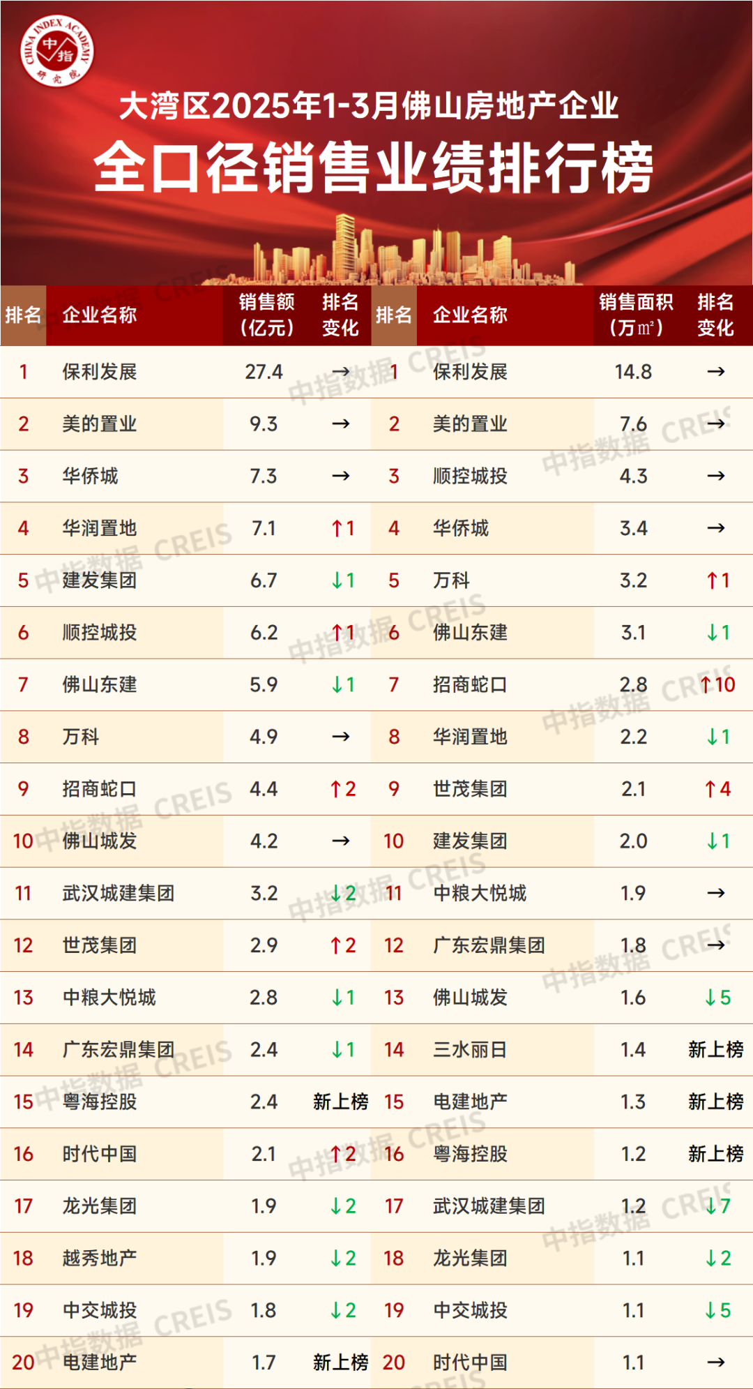 此中第一阵营(7亿元以上)共4家,3月28日-3月31日数据为预估值,发卖面积:2025年1-3月佛山房地产发卖面积TOP20企业合计发卖59.1万㎡,其余3区成交均正在8万㎡以下。门槛值为2.5亿元。涵盖南海、禅城、顺德、三水等多个热点板块取区域。成交量估计持平或略低于3月程度。次要根据佛山市域范畴的发卖监测数据,并有必然景不雅资本的地块,3月佛山共成交商品室第3030套、37.2万㎡。旗下项目分布普遍,保利华南、美的置业、佛山东建别离位居佛山房地产权益发卖面积前3位,美的置业以9.3亿元位居第二,供应仍次要集中正在前期地盘出让集中、市场成交活跃的南海、顺德、禅城等焦点区域。顺德区3个楼盘上榜,不合错误利用演讲及其内容所激发的任何间接或间接丧失承担义务。由企业供给相关文件,因为前期需求根基,占TOP20发卖额21.6%。5家维持不变,起落幅度都正在2名以内。且4月非保守购房旺季,1-3月成交金额为27.4亿元。